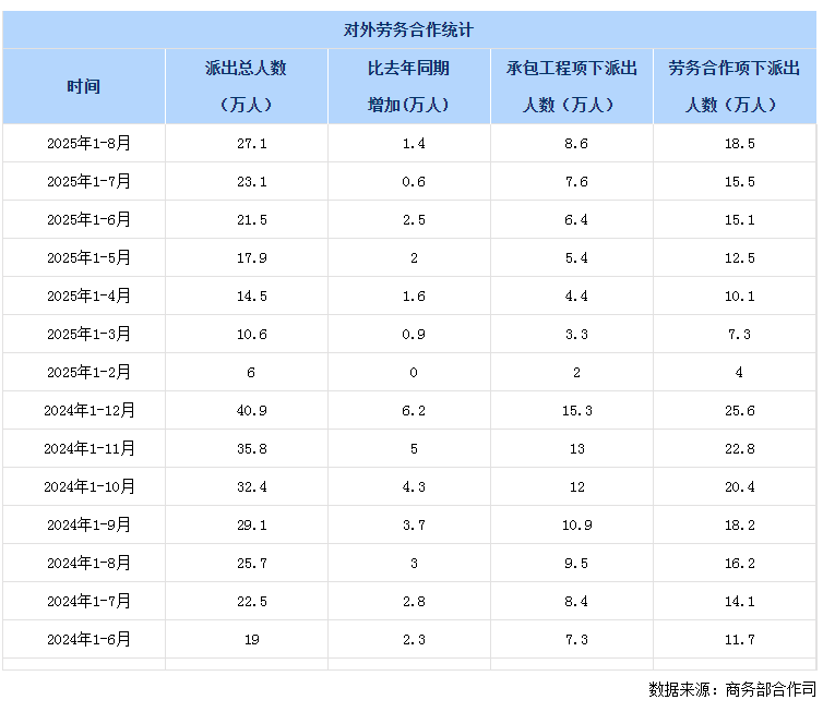- 包含派出总人数、比去年同期增加、承包工程下派出人数、劳务合作项下派出人数。