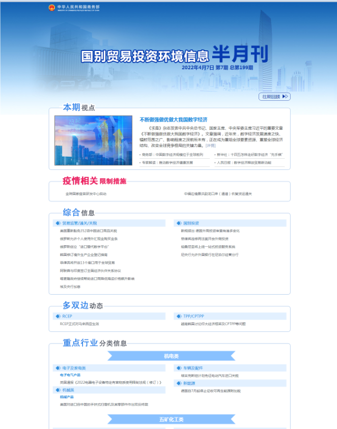 - 数据摘要:国别贸易投资环境信息半月刊,涵盖疫情相关限制措施、综合信息、多双边动态、重点行业分类信息等。