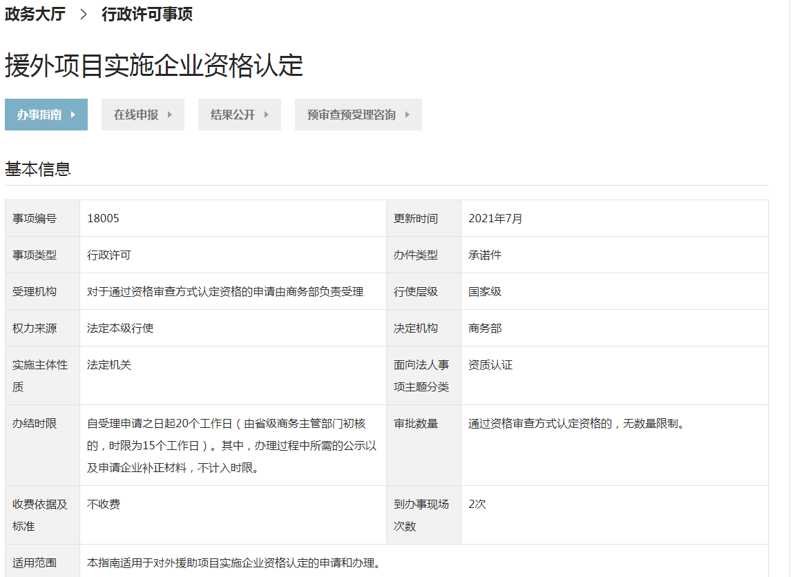 - 援外项目实施企业资格认定涉及办事指南、在线申报、结果公开、预审查预受理咨询。