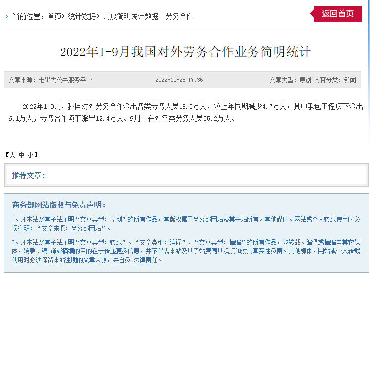 “走出去”公共服务平台-我国对外劳务合作业务简明统计